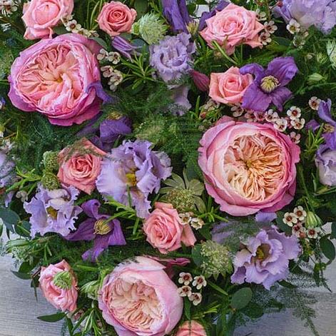 Featuring stunning garden roses, delicate seasonal flowers and scented rosemary, this heart tribute is full of beautiful tones.