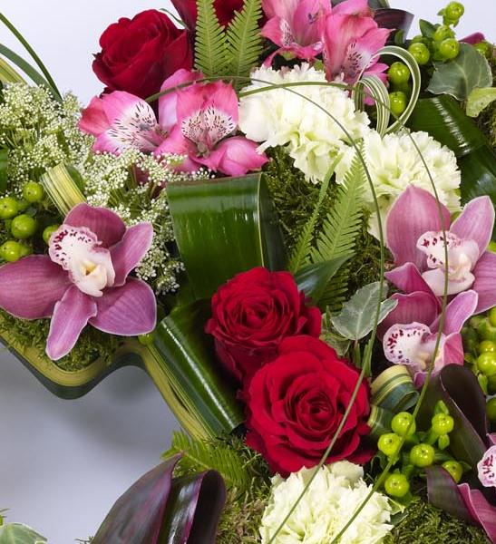 Including Mini cymbidium orchids, carnations, alstroemeria, short-Stem roses in coordinating shades of pink, red, cream and green are nestled into two open heart shapes. Loops grass complete this elegant design.
