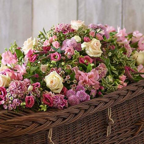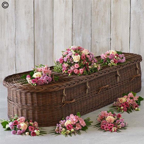 A flowing style of spray that covers the top of the casket with a profusion of blooms. This beautiful spray can also be deconstructed for friends and family to take home.(example image 3 )
