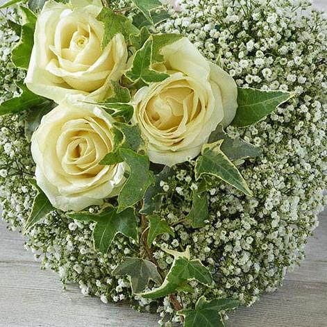 This petite heart tribute of green and white featuring delicate gypsophila and white roses. One of our favourite tributes .