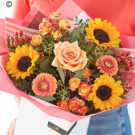 Our grandest autumn bouquet this one is a riot of colour and joy. It's all about celebrating the rich jewel tones we find this time of year, plus capturing the last of the sunshine. It'll feature flowers in vivid shades like ruby, amber, mustard and plum, plus at least five joyous sunflowers.