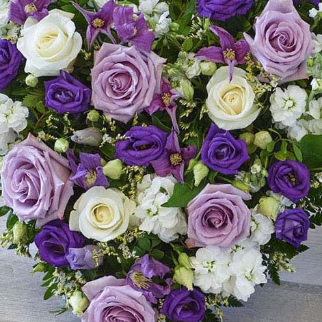 A heart tribute in beautiful purple and white shades,inc lilac roses.