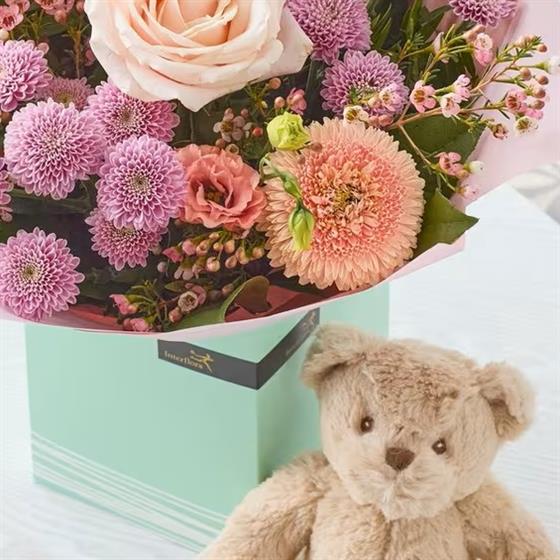 Each and every hand-tied in our New Baby Gift Set is one-of-a-kind, created by an artisan florist using the freshest stems available on the day so, whilst your bouquet will look different to the one pictured, it’ll still be just as lovely (plus it arrives accompanied with a hand-written gift card and an adorable teddy – what’s not to love?).