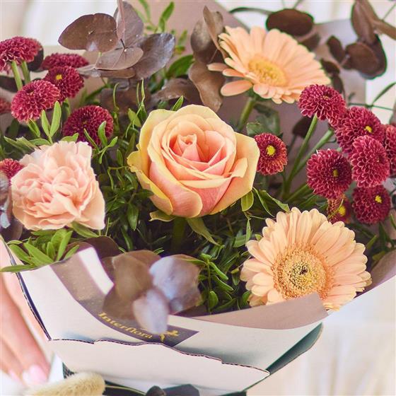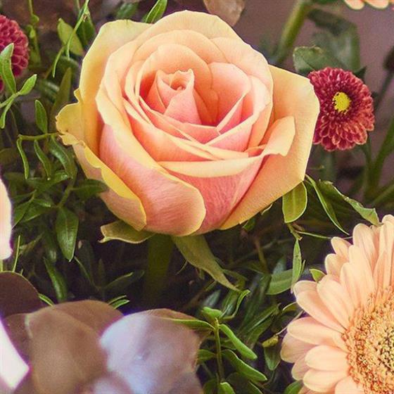 A lovely little gift box with a handmade bouquet of soft, autumn-themed blooms and foliage. Fresh flowers and foliage in the softer shades of the season, you might see blooms in shades of cream, apricot, russet and chocolate.