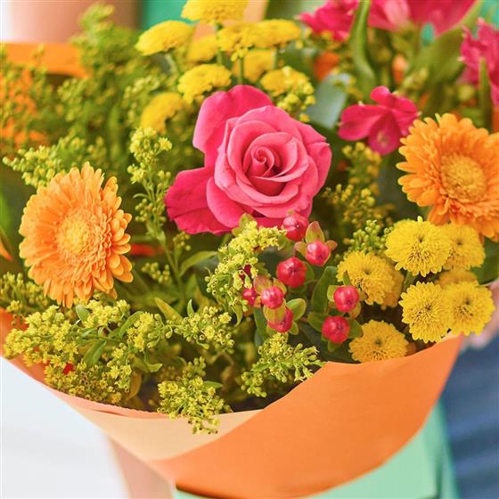 A lovely little gift box with a handmade bouquet of fresh, vivdly coloured flowers inside. Colour & style: fresh flowers and foliage in rich, vivd colours like ruby, amber, mustard and plum.