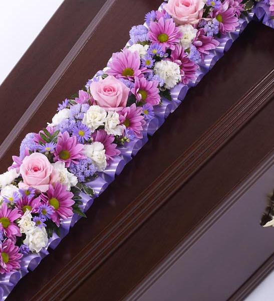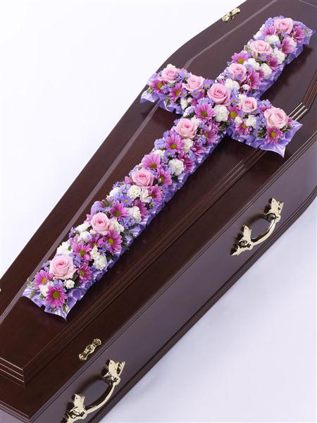 A classic cross covered with a mass of pink and lilac seasonal flowers to including roses.