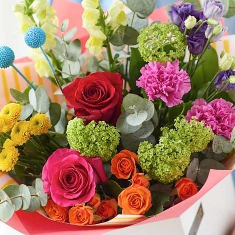 Rainbow bouquet anyone ? This colourful marvel should do the trick. It'll feature blooms in all sorts of shades, from deep burgundy to buttery yellow. Gorgeous.