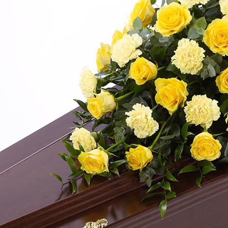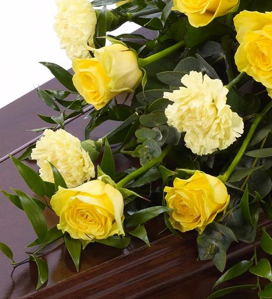 Large-headed white Rose combine with white carnations and luxurious foliages to create this traditional casket spray.