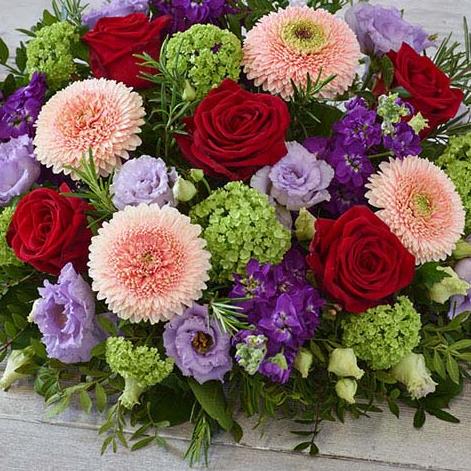 A combination of vibrant roses, soft peach germini and lavender lisianthus, this posy of rich tones also features fragrant stocks.