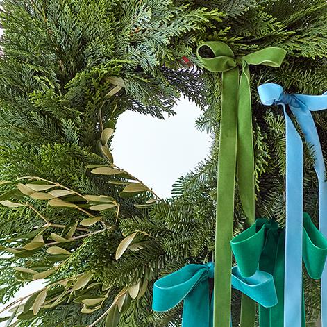 A gorgeous statement wreath inspired by winter's natural beauty of seasonal foliage inc blue pine for scent and olive .Handcrafted by a local florist.