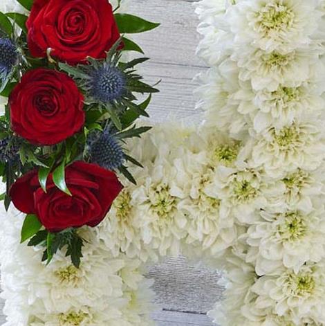 This elegant tribute is crafted using white chrysanthemums with a red finish, a beautiful tribute to your loved one. Please select the appropriate number of letters.