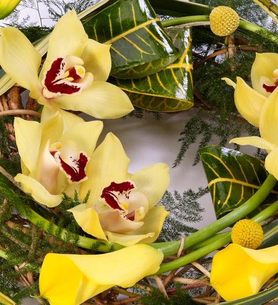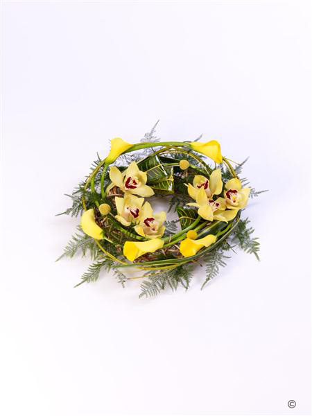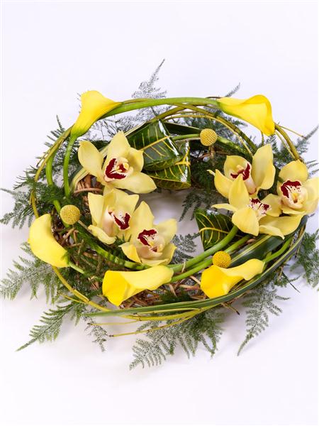 Yellow calla Lily and cymbidium orchids are entwined with cornus Stems, craspedia and asparagus fern around a circular willow frame to create this woodland wreath.